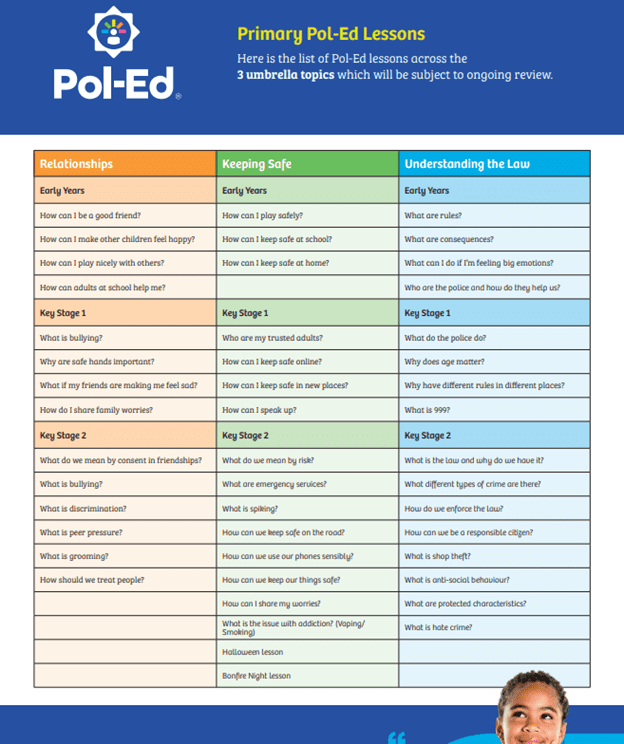 Pol-Ed has three key themes; Relationships, Keeping Safe and Understanding the Law as well as additional themed lessons on key topics such as anti-bullying, knife crime, online safety and road safety. Pol-Ed provides children with an increased knowledge and awareness of risk, greater awareness of community issues and how to keep themselves safe as well as more knowledge of the police and their role in society as trusted people.